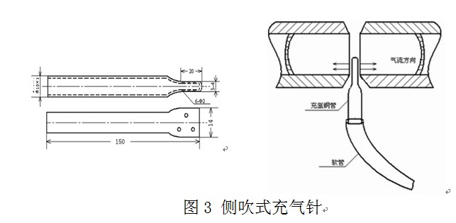 采用圖1 所示的充氬裝置,但將充氣針設計成圖3所示,即將原充氣針端部焊接密封,而在兩個(gè)側面分別鉆3個(gè)φ2mm的小孔,讓氬氣從兩個(gè)側面向氣室送氣。同時(shí)對焊接工藝進(jìn)行調整:打底焊接時(shí)保留充氣針部位不焊,隨即進(jìn)行蓋面層焊接,最后取出充氣針,焊接層次封口。