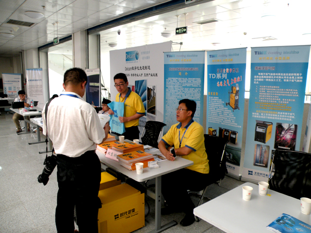 比賽期間所有參賽的領(lǐng)隊、教練和參賽單位領(lǐng)導都被安排在學(xué)院圖文中心二層的大休息廳通過(guò)大屏幕觀(guān)看賽場(chǎng)動(dòng)態(tài)。比賽組委會(huì )只是在上午10點(diǎn)和下午3點(diǎn)安排大家去實(shí)地賽場(chǎng)觀(guān)摩。這種方式和往年相比有所不同。所以圖文中心二層成為參賽隊交流和溝通的唯一場(chǎng)所。廠(chǎng)家的展示區也恰巧設在這里,我們可以很方便地與參賽院校領(lǐng)導零距離接觸。時(shí)代焊機的展位被安排在休憩區前排。為了做好比賽展示活動(dòng),公司提前準備了三套TD系列比武用機分別是:PNE30-315ADP、TDN 3500、TDW 4000。還準備了相關(guān)樣本資料和簽到用具。參加展示活動(dòng)的三位時(shí)代同仁統一穿著(zhù)時(shí)代工服,給人以整齊專(zhuān)業(yè)的印象。時(shí)代展示區的后面用四套易拉寶展具組成展墻,介紹時(shí)代概貌和公司各類(lèi)新產(chǎn)品、新工藝。開(kāi)賽的第一天,不時(shí)有參賽單位老師來(lái)時(shí)代展臺索要資料和咨詢(xún)技術(shù)。他們中的大部分人都是時(shí)代焊機的用戶(hù)。不少老師對時(shí)代產(chǎn)品的現狀和未來(lái)服務(wù)方式十分關(guān)心,還有的詢(xún)問(wèn)明年焊接大賽的籌備情況,有些老師還和我們一起回顧往屆賽事的趣聞和花絮,溝通氣氛十分融洽。也有一些院校有采購焊接設備的意向,前來(lái)洽商具體商務(wù)問(wèn)題。對此我們都一一作答。參賽單位對時(shí)代的認知度十分高。本屆沒(méi)有焊接比賽項目,但時(shí)代焊機依然來(lái)津展示,為此參賽單位對時(shí)代的做法表示贊賞。