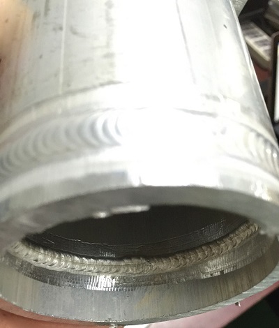 第二模塊鋁合金構建中鋁管的焊接難點(diǎn)主要在于背部融透(如圖6)和內在質(zhì)量的保證。背部融透主要是考驗選手對熔池的理解,在組對焊縫0間隙的情況下,如何能夠識別熔池溫度是否達到,送遞焊絲時(shí)間的選擇,這些都至關(guān)重要,而且在焊接過(guò)程中,由于鋁合金的導熱系數大,焊接過(guò)程中隨著(zhù)溫度的上升,焊接速度也會(huì )越來(lái)越快,如果手法跟不上,只是依靠小電流慢速焊,這樣就會(huì )在某一點(diǎn)(比如引弧處)不停的加熱,局部時(shí)間加熱久了焊縫內部會(huì )很容易出現過(guò)熱裂紋,焊縫表面發(fā)白無(wú)光澤,所以鋁合金焊接一般要求大電流快速焊接,也是為了在引弧初期就能夠快速打開(kāi)鋁合金表面的Al2O3薄膜。該薄膜熔點(diǎn)高達2050℃,極大地超出了鋁的熔點(diǎn)(660℃),由于這層薄膜的保護,所以鋁不易產(chǎn)生腐蝕,但在焊接時(shí),Al2O3會(huì )阻礙熔池金屬良好結合,容易形成夾渣氣孔等缺陷,可以說(shuō)是焊接的障礙,所以在鋁合金焊接中要想達到探傷一級確實(shí)很難。一般要先進(jìn)行酸堿水清洗或機械清理等前期處理。還要保證干燥不潮濕的情況下焊接才能夠保證質(zhì)量,當然對于選手的焊接操作技能也是首選。這次參賽的65名選手中,該項射線(xiàn)探傷滿(mǎn)分40分的情況下只有一人滿(mǎn)分,30分以上的有7人,內在質(zhì)量不得分的占多數。這與鋁合金焊接普及面較窄也有關(guān)系。隨著(zhù)這項賽事的不斷進(jìn)展。我想在不久將來(lái)大家一定會(huì )攻克難關(guān),充分掌握好這門(mén)技術(shù)。